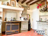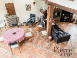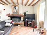 La maison d'environ 170 m² comprend : au RDC, une très belle pièce de vie lumineuse de 75 m² avec cheminée, tomettes et poutres apparentes donnant sur une agréable terrasse et jardin. Une grande cuisine, une salle d'eau avec wc, un bureau et un cellier-buanderie.