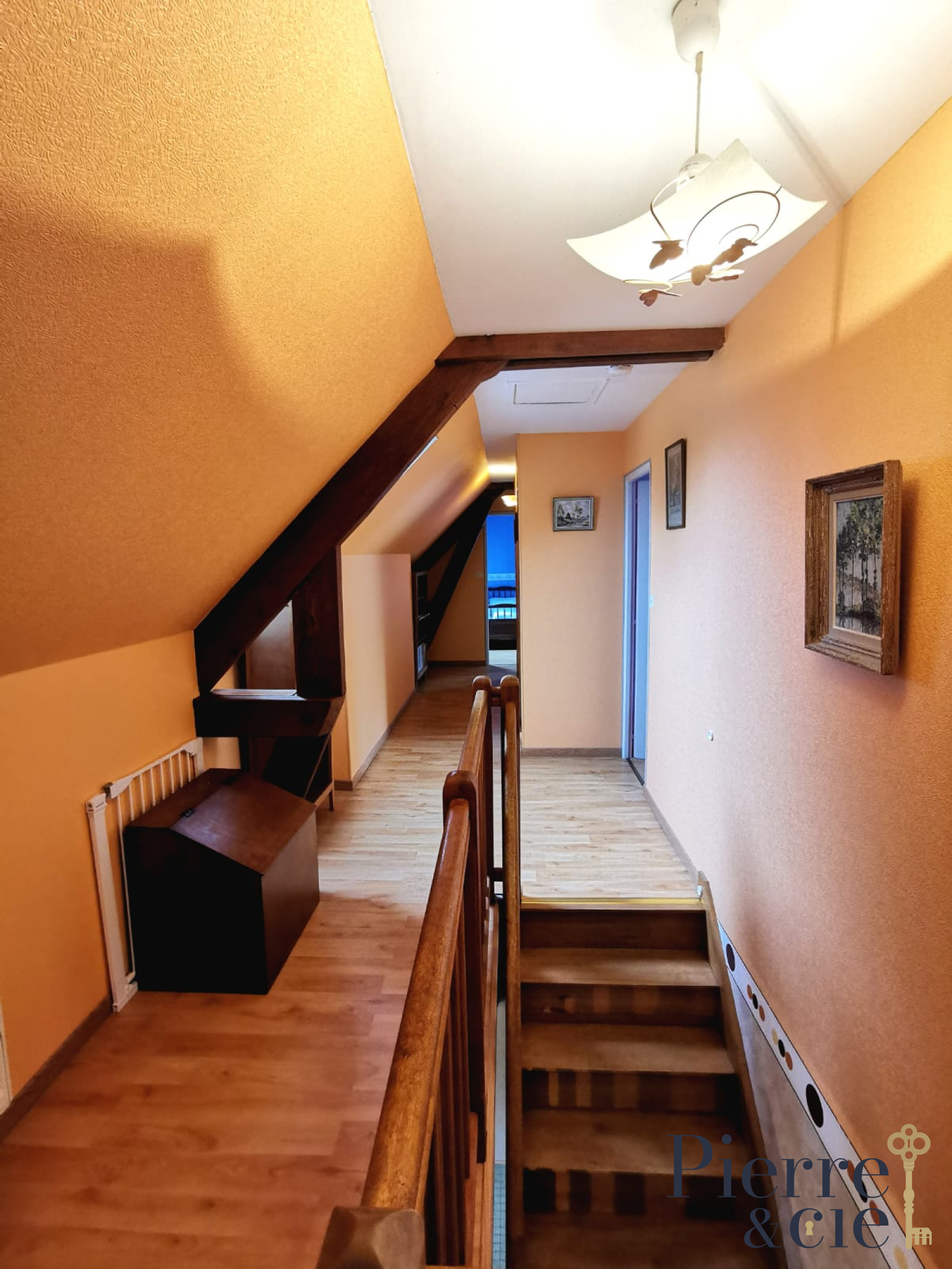 Au premier étage, un escalier d'1,20m de large dessert 4 chambres d'environ 10m² chacune. Une salle de bain et une salle d'eau.